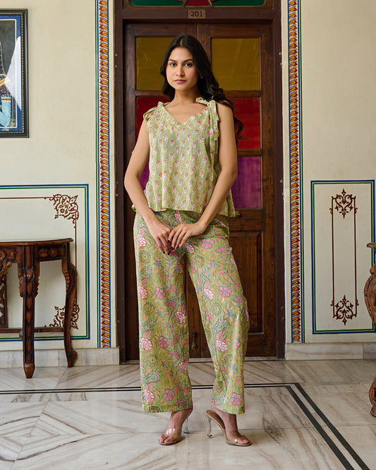 Handcrafted Cotton Co-ord Set – Tie-Shoulder Top & Wide-Leg Pants