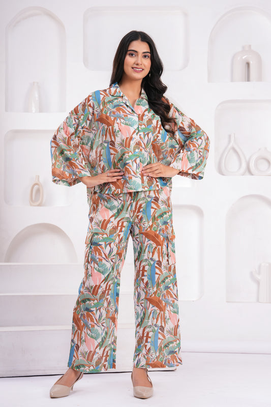 Tropical Leaf Hand Block Print Cotton Co-ord Set – Relaxed Fit with Flared Sleeves