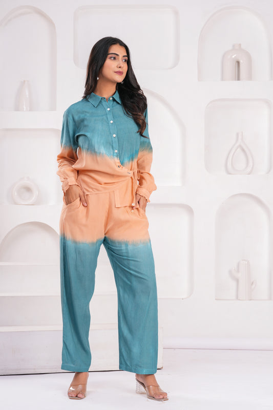 Peach & Teal Ombre Co-ord Set – Modal Fabric with Full Sleeves and Waist Tie Detail
