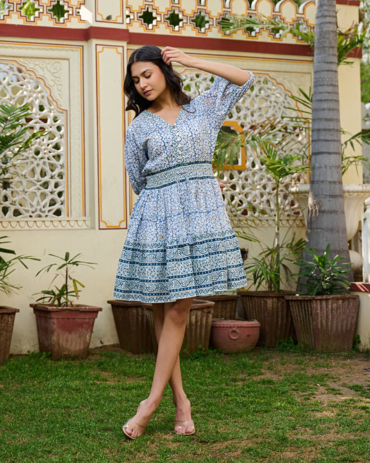 Blue & White Floral Hand-Block Printed Cotton Mini Dress – Tie-Up Back