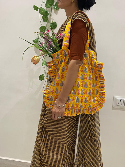 Hand block Cotton Tote Bag ā Yellow Paisley Floral with Frill | 34x38 cm