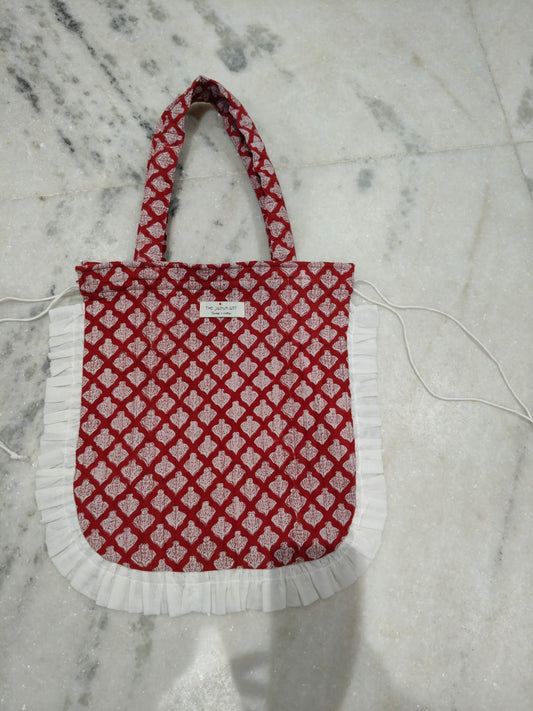 Quilted Hand block Printed Tote Bag with Frill ā 100% Cotton | 34x38 cm