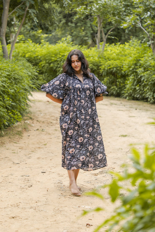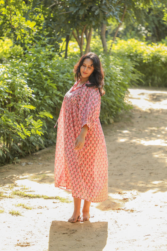 Hand Block Printed Floral Art Peach Handmade Cotton Gift For Her Breathable Midi Dress