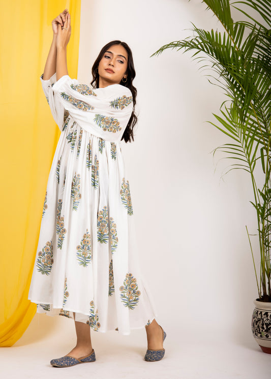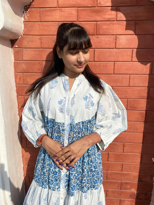 Introducing Beautiful Hand Block printed White Blue Midi Dress