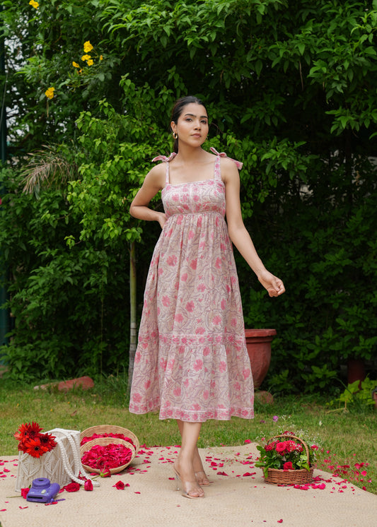 Floral Hand Block Print Cotton Midi Dress with Yoke Detailing