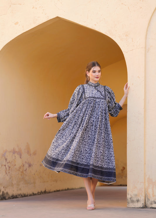 Handblock Printed Cotton New Arrival Vrinda Midi~ Midnight Dress