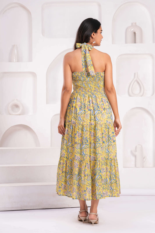 Yellow Floral Halter Neck Midi Dress ā Cotton with Back Tie & Smocked Fit