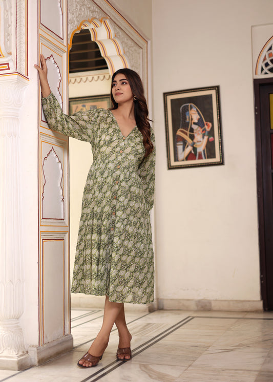 Hand Block Printed Anna Green Midi Hippie Cotton Dress