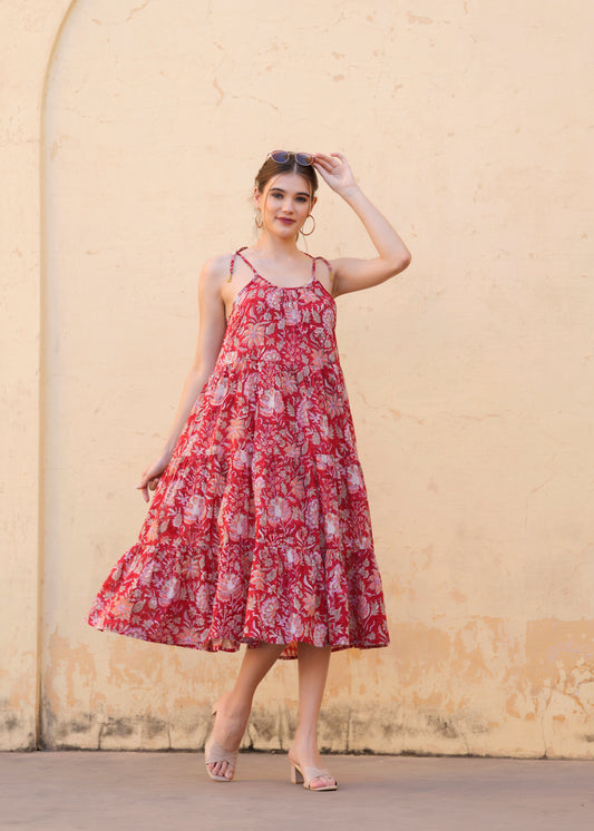Beautiful Hand Block-Printed red Floral Midi Dress