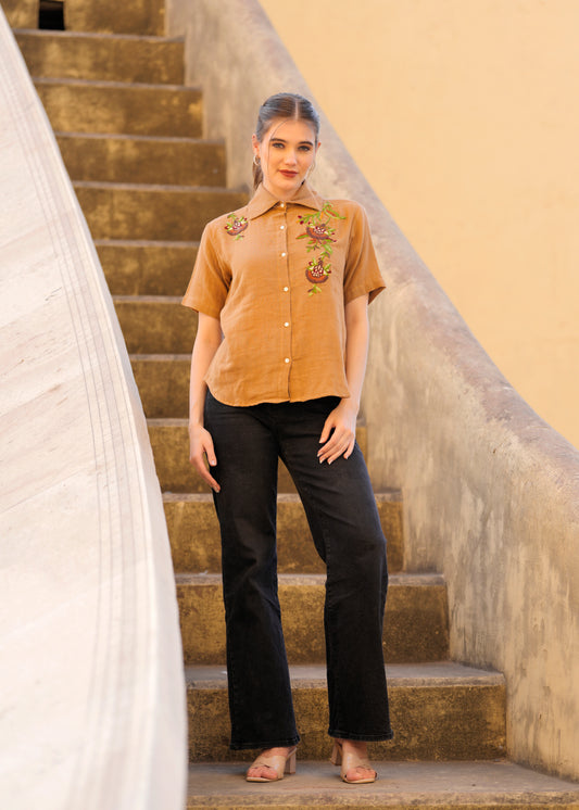 Hand Block Printed Cotton Striped Shirt Hand Embroidered Floral Detail, Ruffle Sleeves
