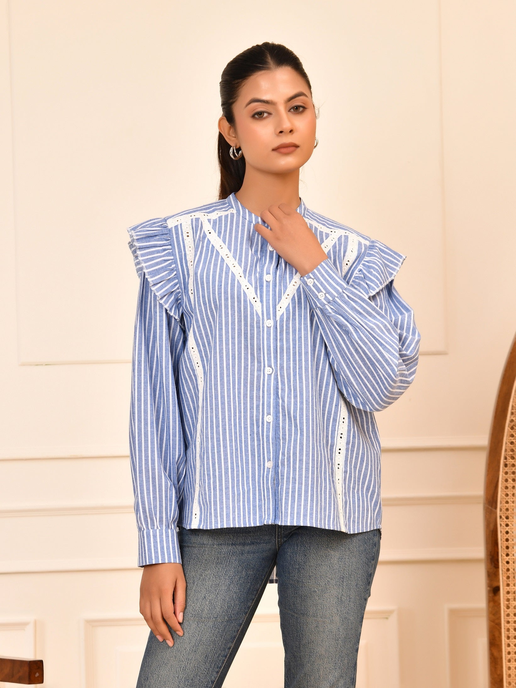Blue & White Striped Cotton Lace Detail Blouse Full Sleeves with Ruffle Design