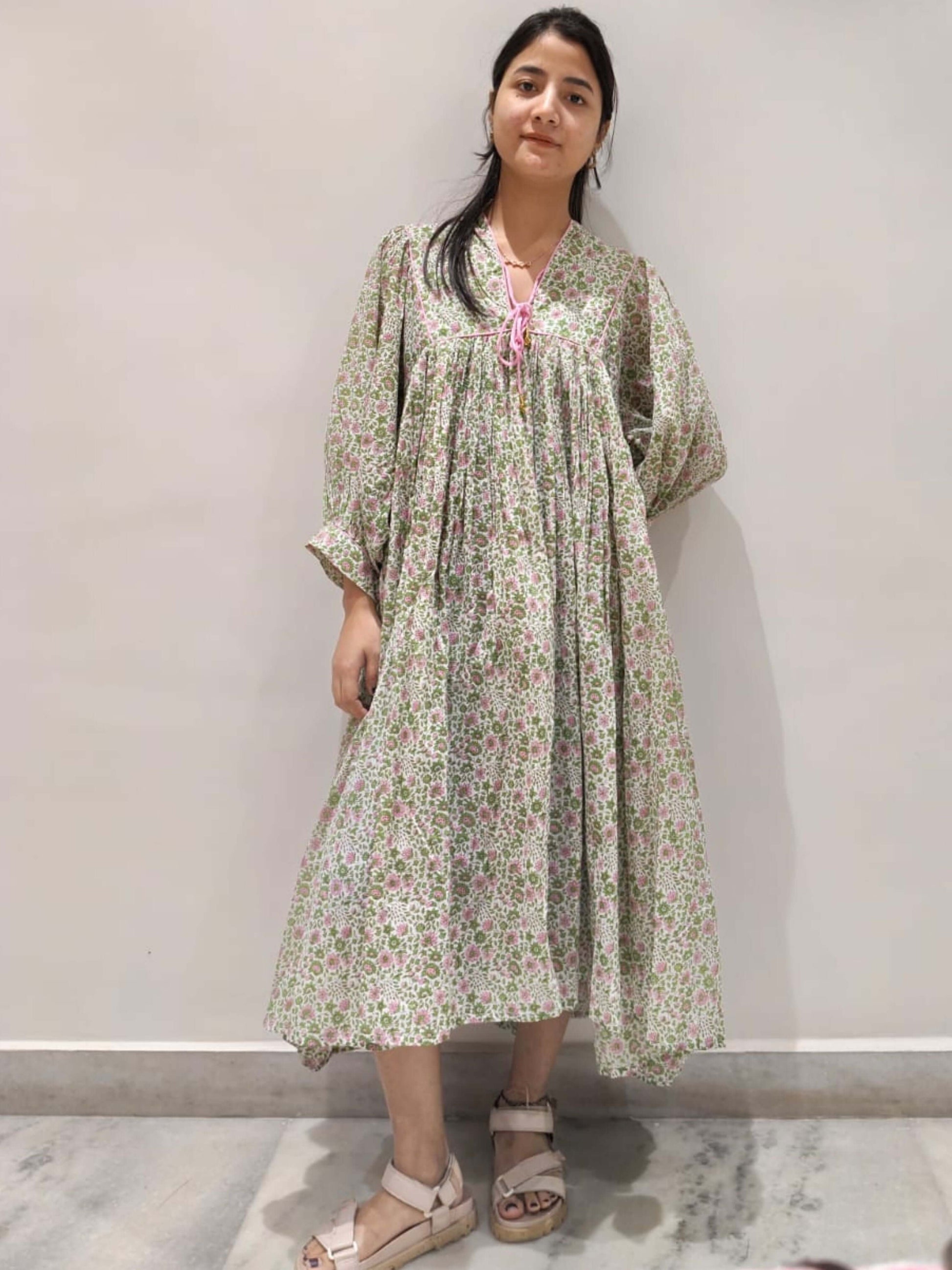 Stay effortlessly stylish in this hand block printed midi dress, crafted from soft breathable cotton. Its floral design, relaxed fit, and tie-up neckline make it a versatile choice for both everyday comfort and casual outings.