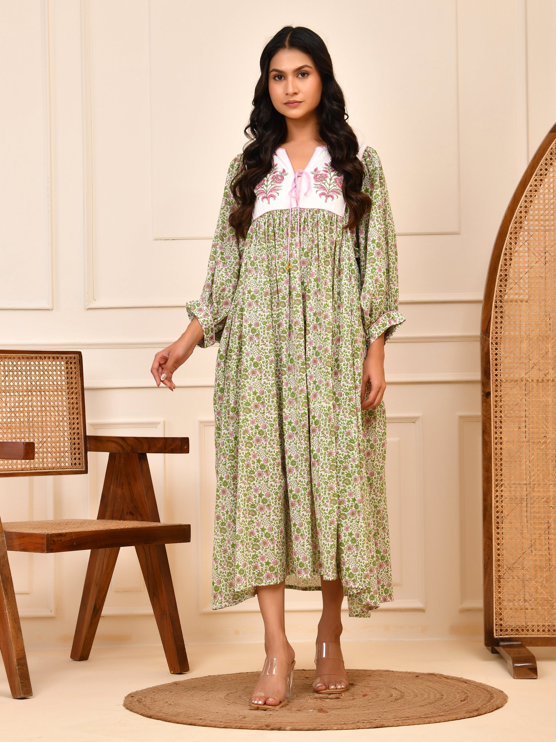 Floral Hand Block Print Cotton Midi Dress with Yoke Detailing
